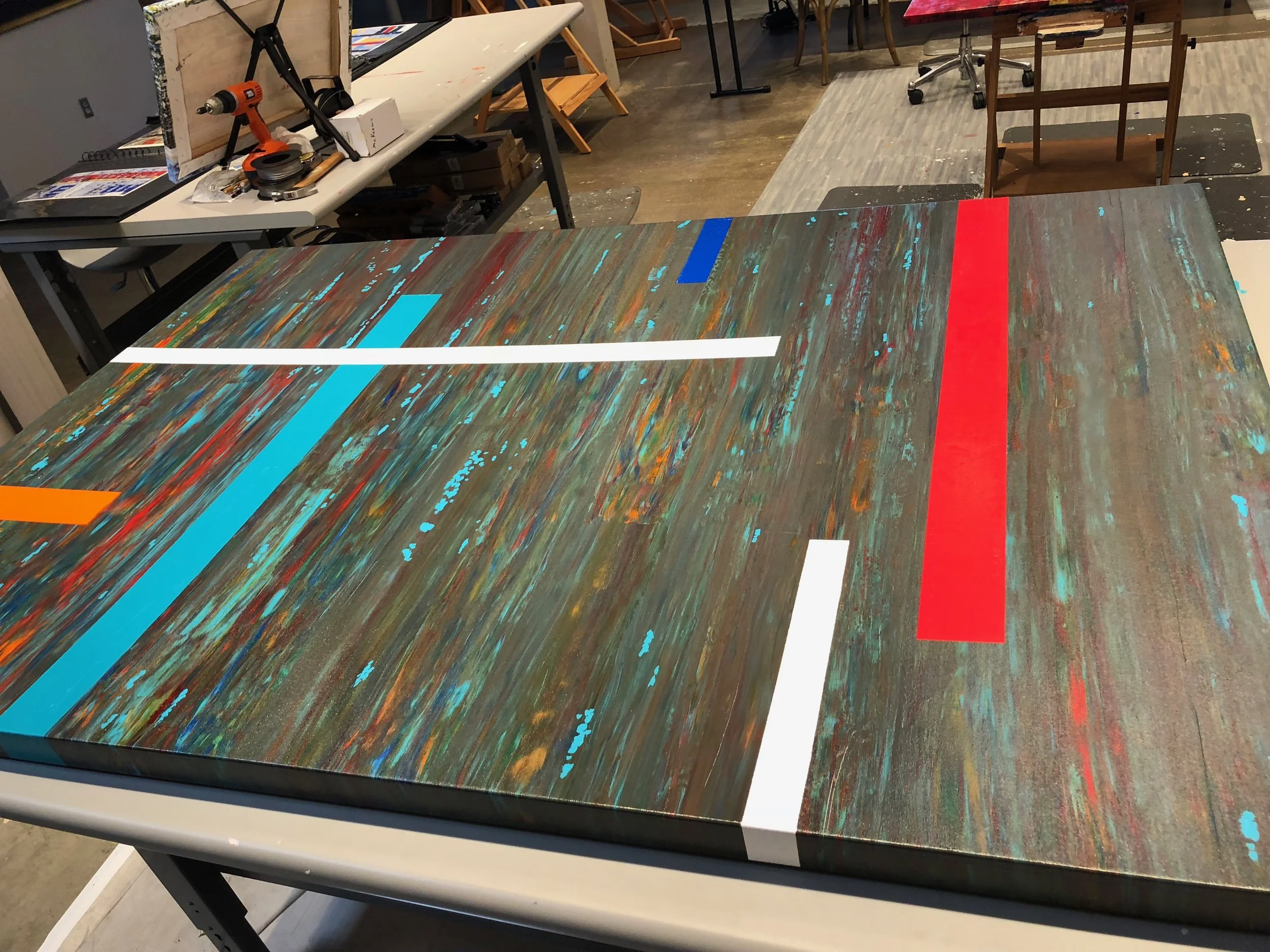 I love doing this kind of painting...First there was no added color "stripes", now there are two. Tomorrow and the next days I'll let it linger where I can see it and soon it will come to me what to do with it next. There are so many possibilities! I sit a distance away and eye it with a pencil or any thin straight object I can find to hold it up and play with different lines. Oh so many choices!! It's a big one too so lots of room to play with, 78 x 54. Let the games begin! Cheers! (I also call this kind of painting a ‘secondary painting’ as the color was scraped off of another painting and instead of throwing it away, I scrape it on a new canvas. Each time it’s like magic, I love doing this!!)